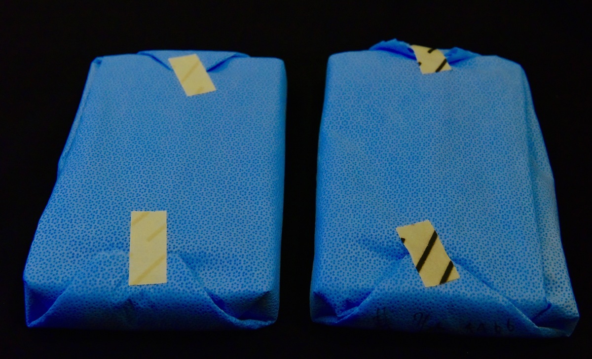 厚紙22枚の中心部分に化学的インジケータはセットされる。中心部まで蒸気が浸透すれば変色し、例えば折り重ねられたタオルの中心にまで蒸気が行き渡り殺菌されていると考える。